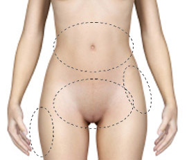 Figure 1. Les endroits du corps où est généralement pratiquée la liposuccion sont le haut et le bas de l’abdomen, les hanches et la culotte de cheval.